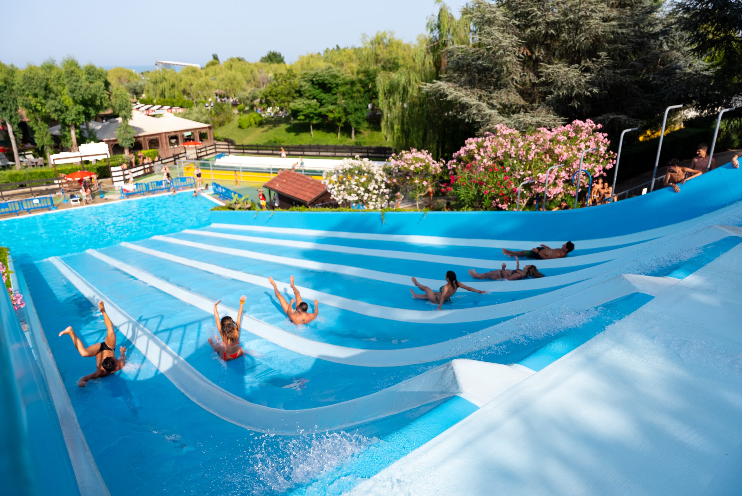 - Piscina Onde: Il cuore pulsante del parco. Una vasca immensa dove, al suono della sirena, ci si diverte a saltare tra le onde come in mare aperto.