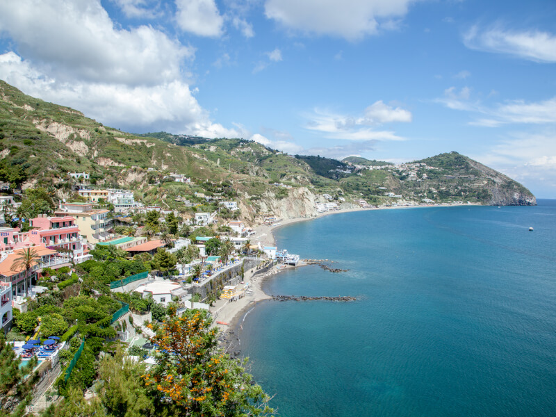 Oltre alle sue terme famose nel mondo, Ischia offre paesaggi marini mozzafiato. Il versante di Sant’Angelo e la baia di Cartaromana ai piedi del Castello Aragonese sono luoghi iconici dove la storia si specchia nel mare. Proprio sotto il castello, fenomeno unico, si possono osservare emissioni gassose sottomarine (“vents”) che creano colonne di bollicine, testimonianza dell’anima vulcanica dell’isola.
