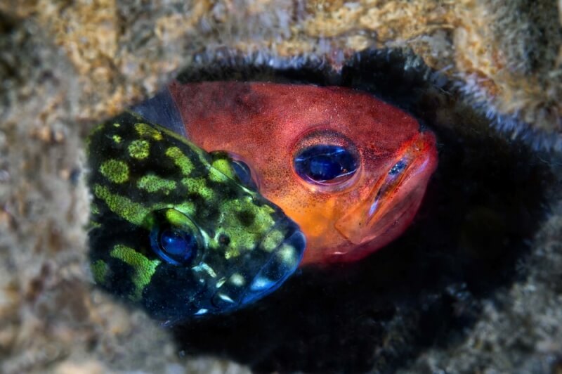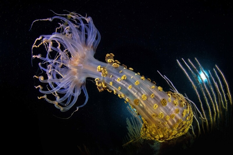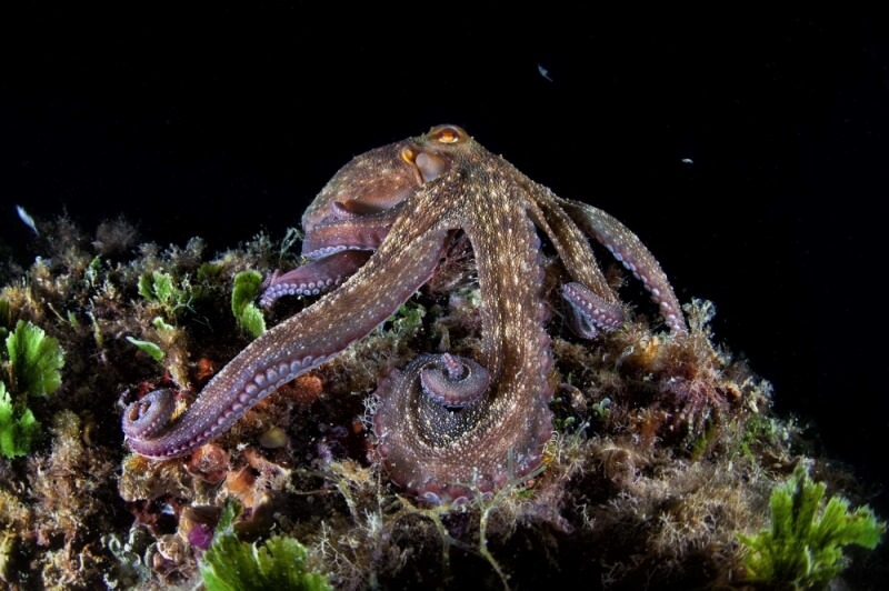 Il Parco Sommerso non è solo pietre antiche; le rovine hanno creato un substrato artificiale perfetto per la biodiversità. Le colonne e i muri romani sono oggi ricoperti da alghe colorate, spugne e organismi incrostanti che creano un ecosistema di “precoralligeno”. I fondali sabbiosi ospitano praterie di Cymodocea nodosa e macchie di Posidonia oceanica, fondamentali per l’ossigenazione dell’acqua e rifugio per cavallucci marini, polpi, saraghi e scorfani che nuotano tra le anfore.