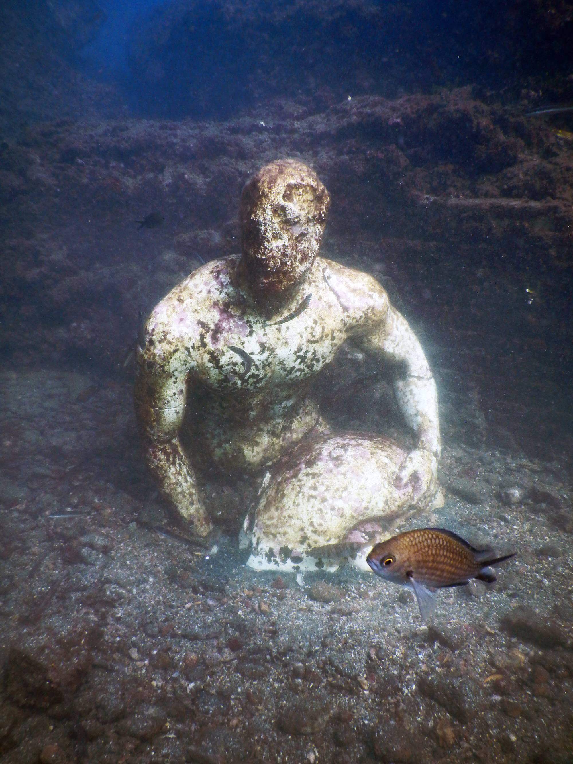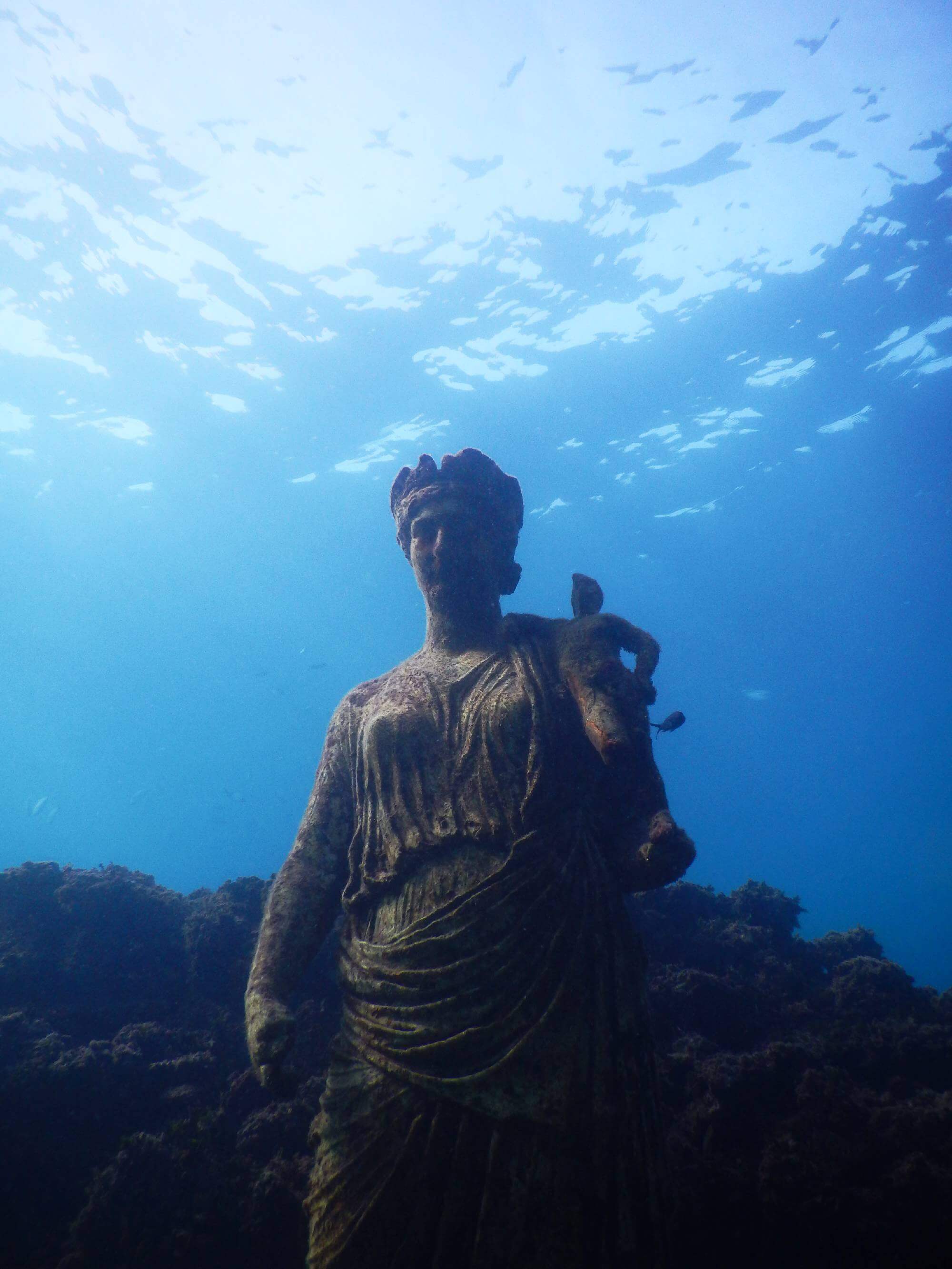 A soli 5-6 metri di profondità, nei pressi di Punta Epitaffio, si trova uno degli ambienti più spettacolari: il Ninfeo dell’imperatore Claudio. Si tratta di una sala rettangolare con abside che un tempo era una sala da pranzo imperiale. Oggi è possibile nuotare tra le ricostruzioni delle statue originali (le vere sono al Museo Archeologico dei Campi Flegrei) che adornavano le nicchie, tra cui le figure della famiglia imperiale e il gruppo scultoreo di Ulisse e Polifemo. L’effetto di vedere questi volti marmorei emergere dal fondale sabbioso è indimenticabile.