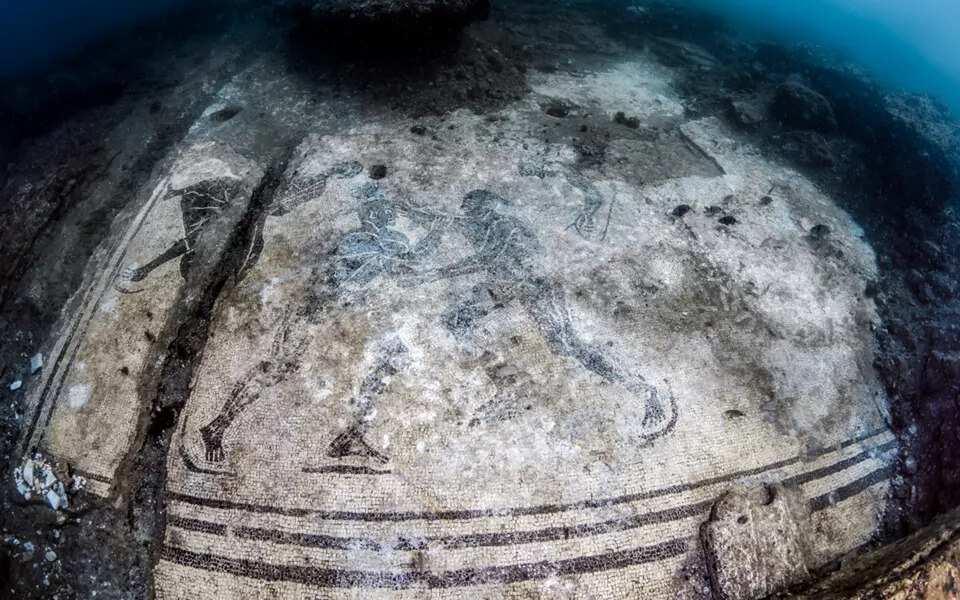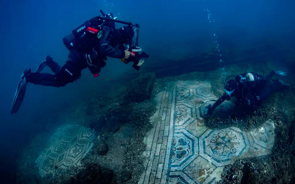 Questa domus romana prende il nome dal suo particolare ingresso porticato con due sedili in muratura, ancora perfettamente riconoscibili. Il vero tesoro qui sono i mosaici pavimentali: splendidi tappeti di tessere bianche e nere con decorazioni geometriche ed esagonali che i restauratori subacquei “svelano” periodicamente rimuovendo lo strato di sabbia protettiva. È un’esperienza emozionante vedere i colori antichi riaccendersi sotto la luce del sole che filtra dall’acqua bassa.