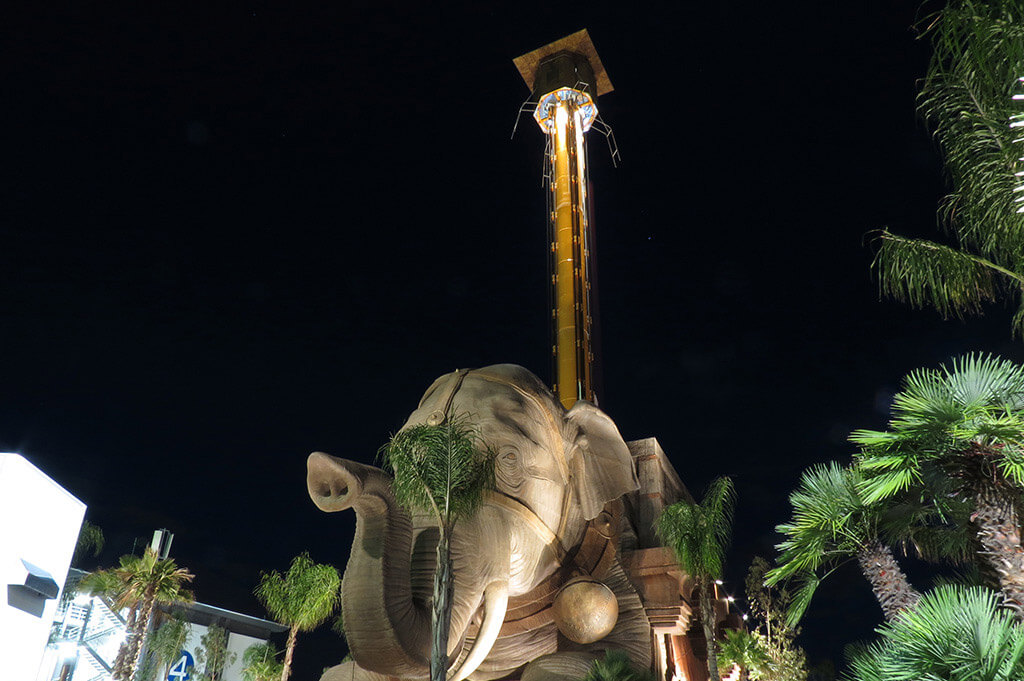 • Indiana Adventure. È una torre di caduta libera alta 60 metri ambientata in una giungla che si sviluppa sulla schiena di un grosso elefante. L’ospite può scegliere tre sistemi di caduta: da seduto, inclinato o in piedi.