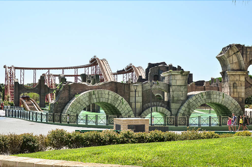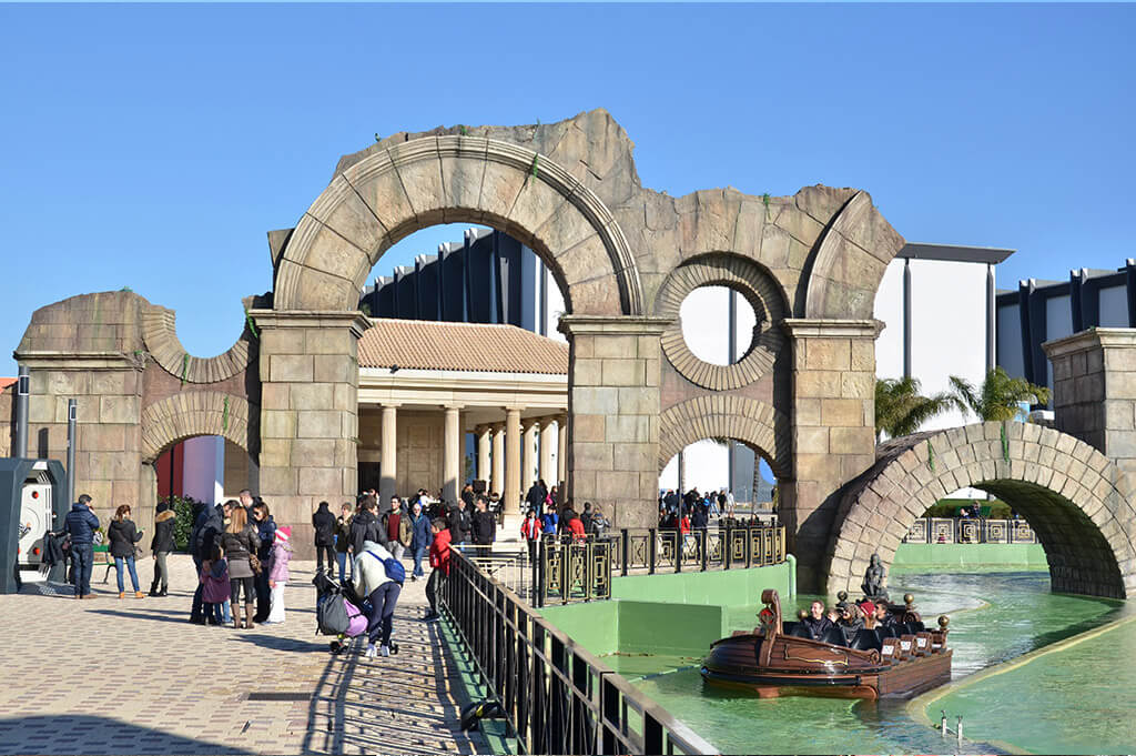 • Aktium. È un’attrazione acquatiche ambientata tra rovine dell’Antica Roma. Sedici passeggeri salgono su un’imbarcazione che li porterà alal Baia di Azio per affrontare due grande discese a 70 Km/h di velocità.