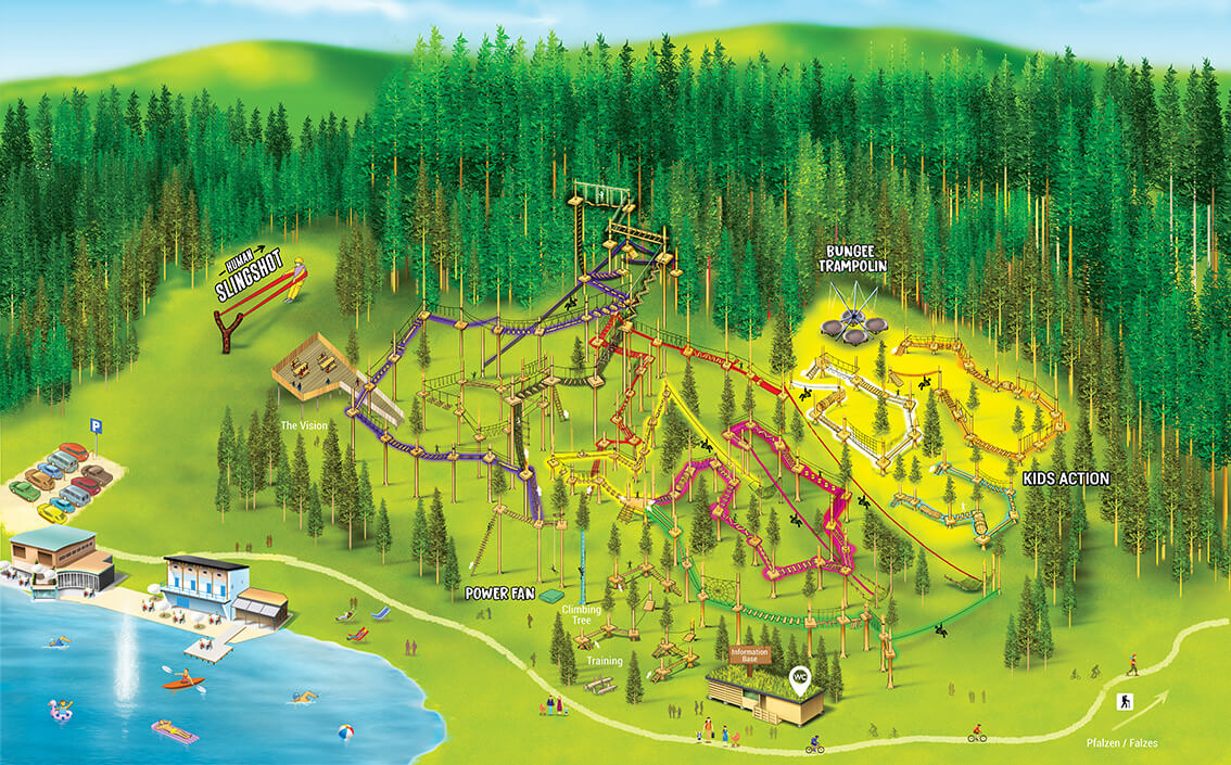 Benvenuti al KronAction, il parco avventura più grande dell’Alto Adige, situato in una posizione idilliaca presso il Lago d’Issengo (Issinger Weiher), tra Falzes e Chienes. Immerso nella natura incontaminata della Val Pusteria, questo parco offre un mix perfetto di adrenalina, sport e divertimento per tutte le età. Con oltre 140 stazioni distribuite su 14 percorsi diversi, è la destinazione ideale per chi vuole mettere alla prova le proprie abilità o semplicemente godersi una giornata attiva all’aria aperta.