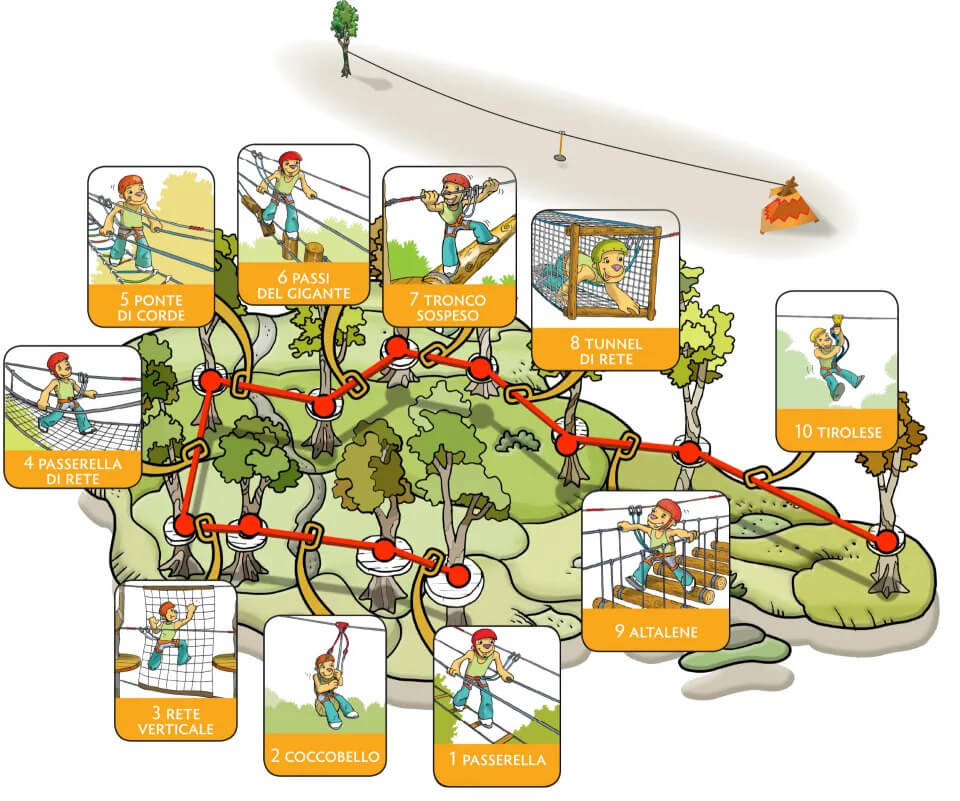 - Percorsi Junior (6-11 anni): Una progressione di 5 percorsi (Junior 1, 2, 3, Family e Discovery) pensati per crescere con le abilità dei bambini. Dai 6-7 anni (>120cm) si accede ai primi livelli; dagli 8 anni (>130cm) si possono affrontare percorsi più alti, accompagnati da un adulto sui tratti più impegnativi come il Family.