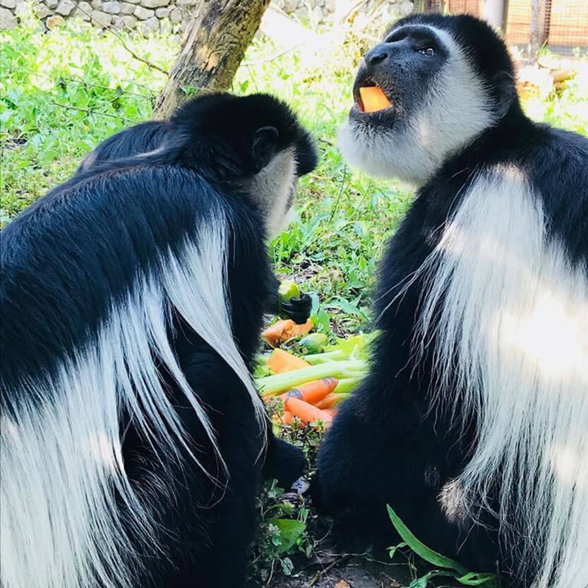 • Guereza. Sono scimmie diurne che popolano le foreste dell’Africa centrale. Si caratterizzano per un inconfondibile mantello bicolore e per i numerosi versi intimidatori che sono in grado di riprodurre. La loro vita sociale è regolata da un maschio dominante e lunghe sessioni di riposo.