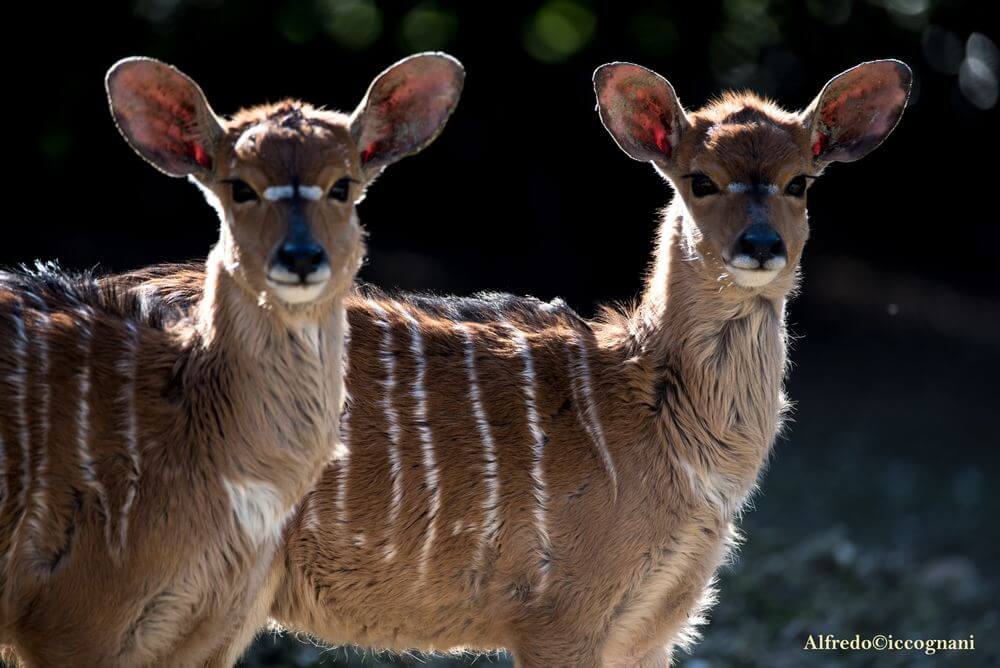 - Nyala. È un’antilope del sud Africa dalle corna a spirale. Vive in piccoli gruppi familiari composti da 10 individui e adora trascorrere le giornate nei grandi spazi all’aperto. I maschi, rispetto alle femmine, si distinguono per le corna e una lunga barba che cresce sulla gola e nelle regioni inferiori.