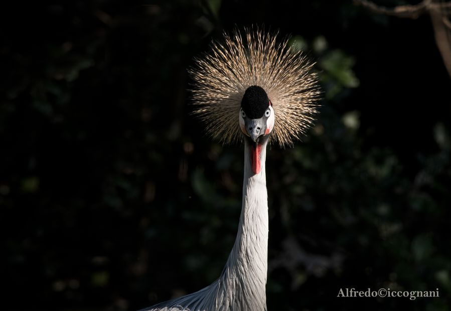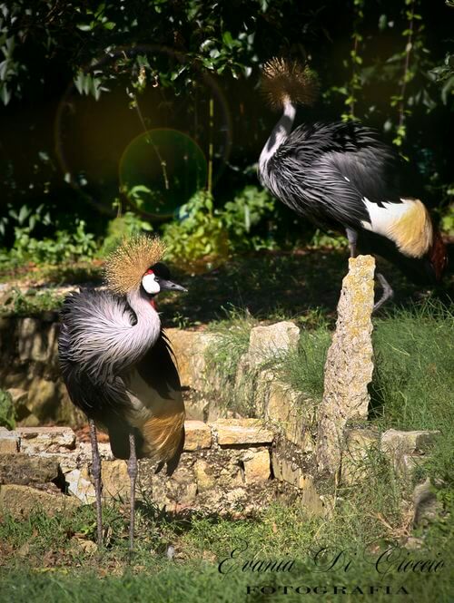 - Gru coronata. È un volatile delle zone umide dell’Africa subsahariana. Il suo aspetto si caratterizza per un ciuffo di piume nere sul capo e una corona di piume rigide gialle che spuntano sulla nuca. Si nutre di cereali e di piccoli animali.