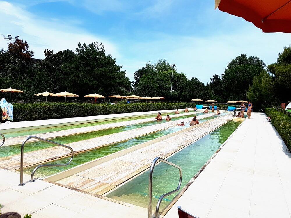- La Grande Piscina: Il cuore del parco. Una vasca immensa di 800 mq con acqua termale riscaldata a 30°C. Grazie alla profondità graduale e ai 27 getti a ventaglio, è l’ideale per nuotare dolcemente o farsi massaggiare dall’acqua.
