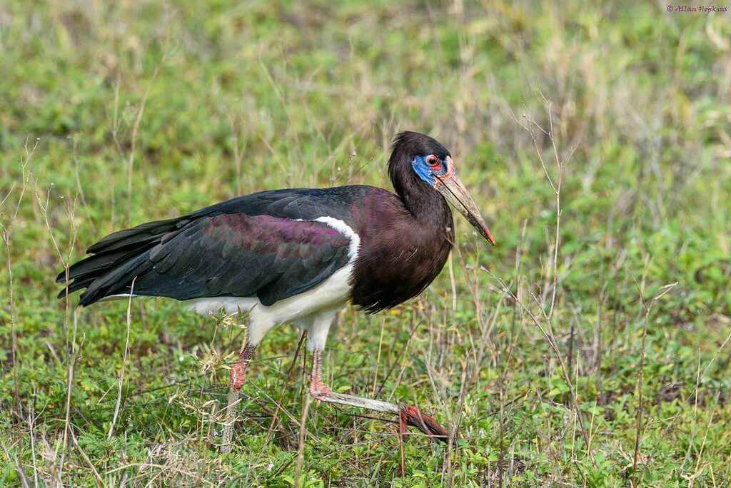 - Cicogna Ventrebianco. Nonostante sia un grande uccello è considerato il più piccolo della specie delle cicogne. Si caratterizza per una colorazione nera con zampe grigie e piedi rossi.