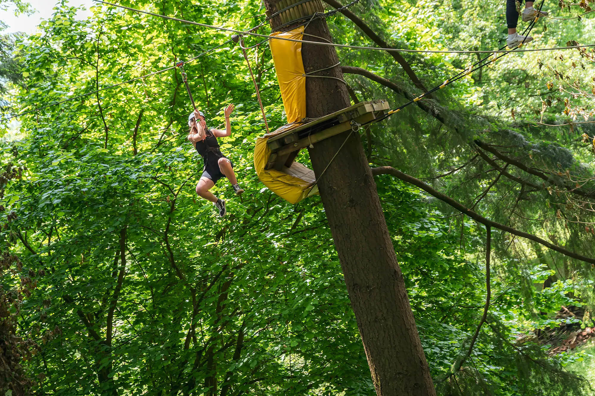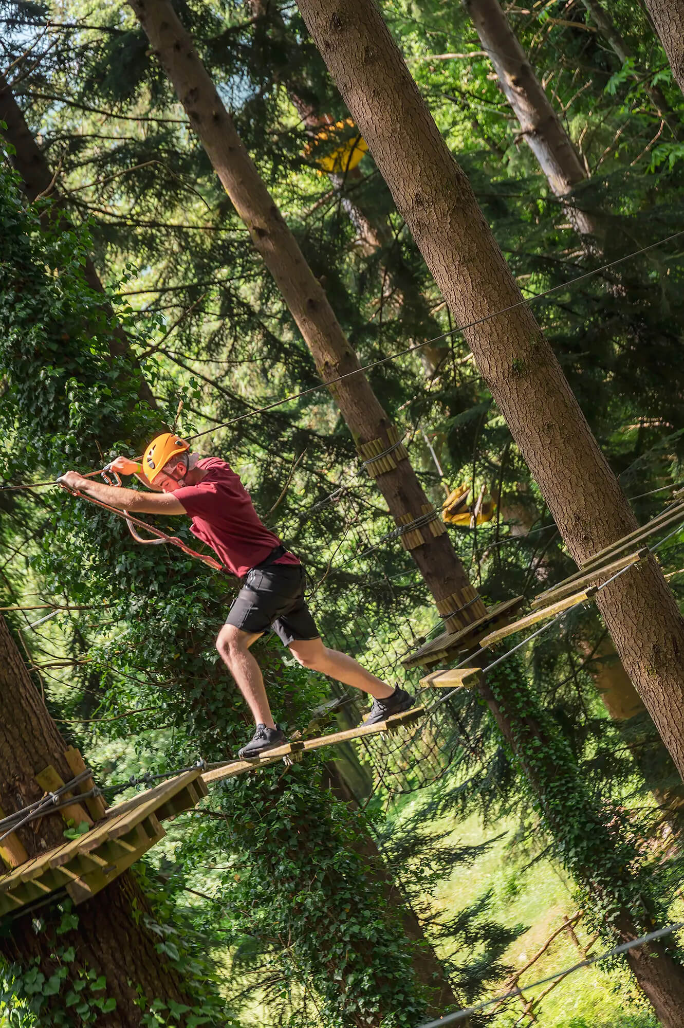 • Percorso Giallo: Ideale per i piccolissimi (da 100 cm). Situato a poco più di un metro da terra, permette ai genitori di seguire i figli passo dopo passo da terra.